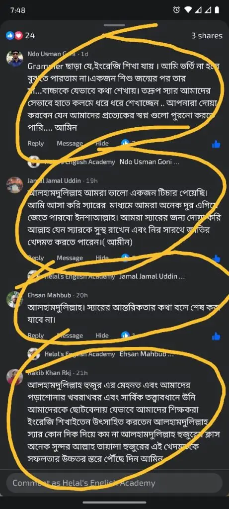 আপনারা ইংরেজি মুখে আনতে পারেন না এর কারণ হলো আপনার মুখে ইংরেজি বলার অভ্যাস নাই। তাই আমি হেলাল নিজে আপনাকে সরাসরি মুখে মুখে ইংরেজি বলা প্র্যাকটিস করাবো ইনশাআল্লাহ।